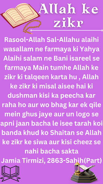 Rasool-Allah Sal-Allahu alaihi wasallam ne farmaya ki Yahya Alaihi salam ne Bani isareel se farmaya Main tumhe Allah ke zikr ki talqeen karta hu , Allah ke zikr ki misal aisee hai ki dushman kisi ka peecha kar raha ho aur wo bhag kar ek qile mein ghus jaye aur un logo se apni jaan bacha le isee tarah koi banda khud ko Shaitan se Allah ke zikr ke siwa aur kisi cheez se nahi bacha sakta